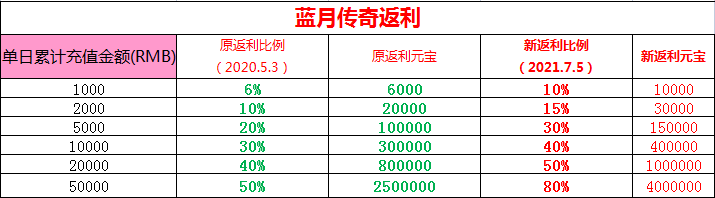 XY《蓝月传奇》应广大会员多方反映,对充值返利进行调整升级如下: