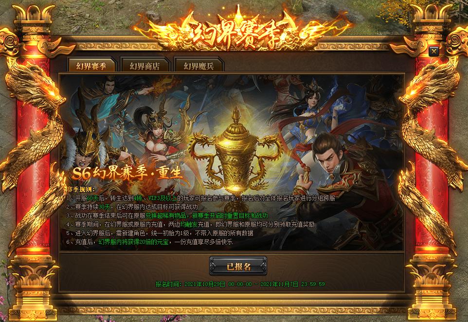 “幻界赛季”需报名参加:满足报名条件的玩家在规定的时间内于页面报名成功后,系统将在“蓝月传奇全平台”范围内对已报名的玩家进行分配,进入为期30天的“幻界服”内参与赛季