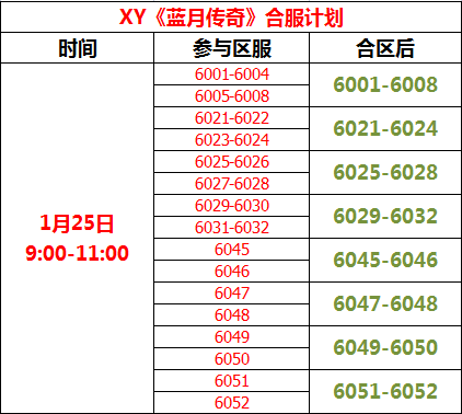 为了活跃游戏气氛,满足玩家需求,亲爱的玩家让广大玩家可以延续更激烈的战斗,XY《蓝月传奇》将于2022年1月25日对以下区服进行合服操作,合服期间玩家不能登录游戏,请各位玩家知晓并相互转告,感谢大家的支持!服务器开放时间会根据维护操作完成时间提前或者延迟开启,不便之处敬请体谅.
