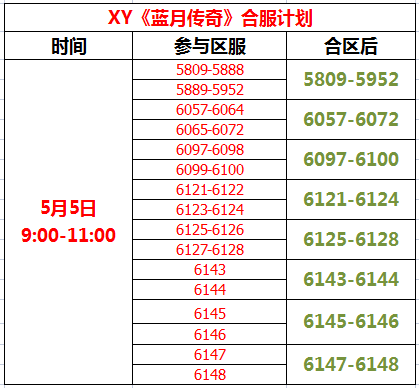为了活跃游戏气氛,满足玩家需求,亲爱的玩家让广大玩家可以延续更激烈的战斗,XY《蓝月传奇》将于2022年5月5日对以下区服进行合服操作,合服期间玩家不能登录游戏,请各位玩家知晓并相互转告,感谢大家的支持!服务器开放时间会根据维护操作完成时间提前或者延迟开启,不便之处敬请体谅.