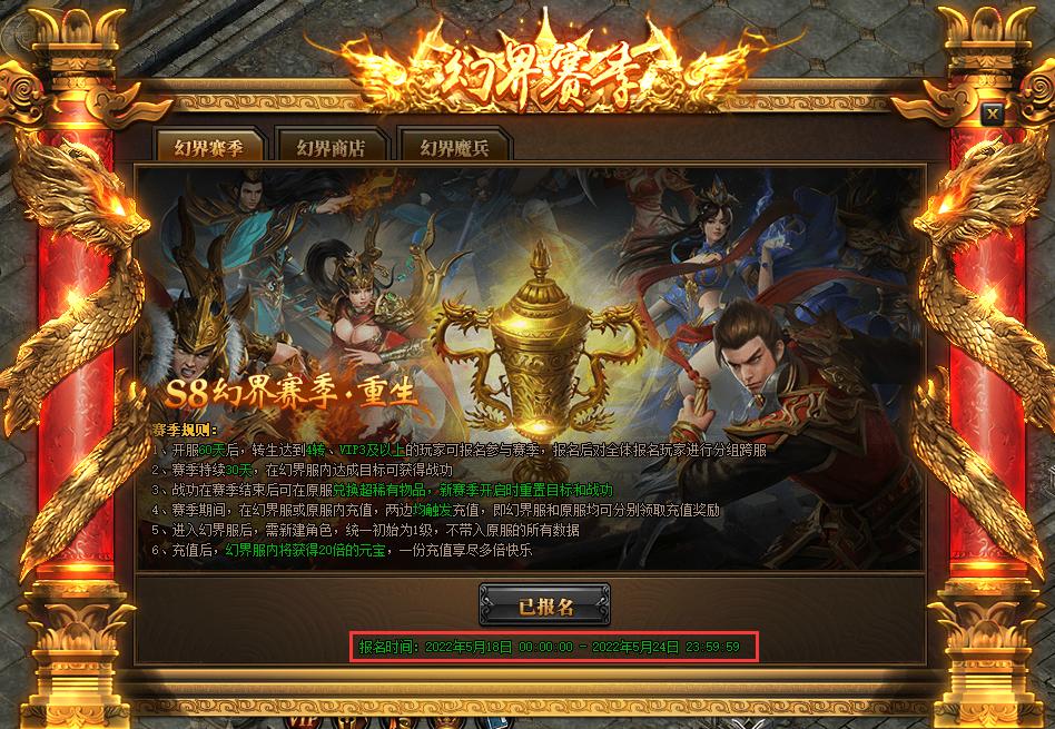 “幻界赛季”需报名参加:满足报名条件的玩家在规定的时间内于页面报名成功后,系统将在“蓝月传奇全平台”范围内对已报名的玩家进行分配,进入为期30天的“幻界服”内参与赛季