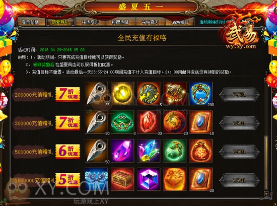 登陆好礼热身,充值折扣给力!4月29日至5月3日,XY游戏《武易》五一盛典还将开启史上最优惠折扣抢购!活动期间,XY游戏《武易》玩家完成充值目标,不仅可获得超值道具大礼包,还可获得狂热商店优惠资格!充值越高,折扣越低!最低可五折购得全场珍品。买一送一,抢到赚到!另外,XY游戏《武易》五一消费排行也在等你全力冲击,力争第一,豪华坐骑等你骑!