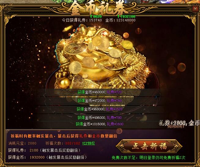 5、祈福时有几率触发暴击,获得礼券和金币翻倍。